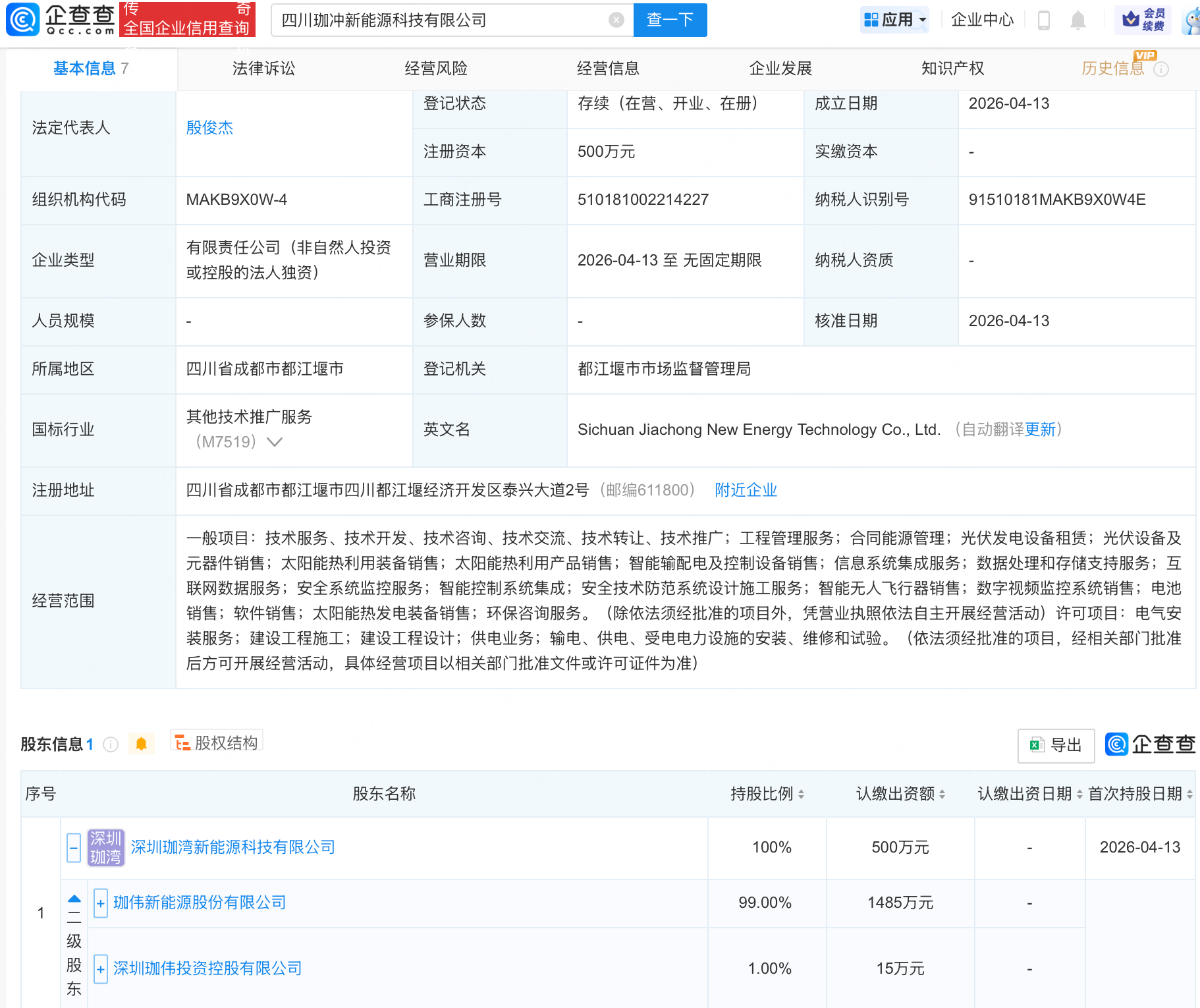 近日,四川珈冲新能源科技有限公司成立,经营范围包含:安全技术防范系统设计施工服务;智能无人飞行器销售;数字视频监控系统销售;电池销售等。企查查股权穿透显示,该公司由珈伟新能(300317)旗下深圳珈湾新能源科技有限公司全资持股。